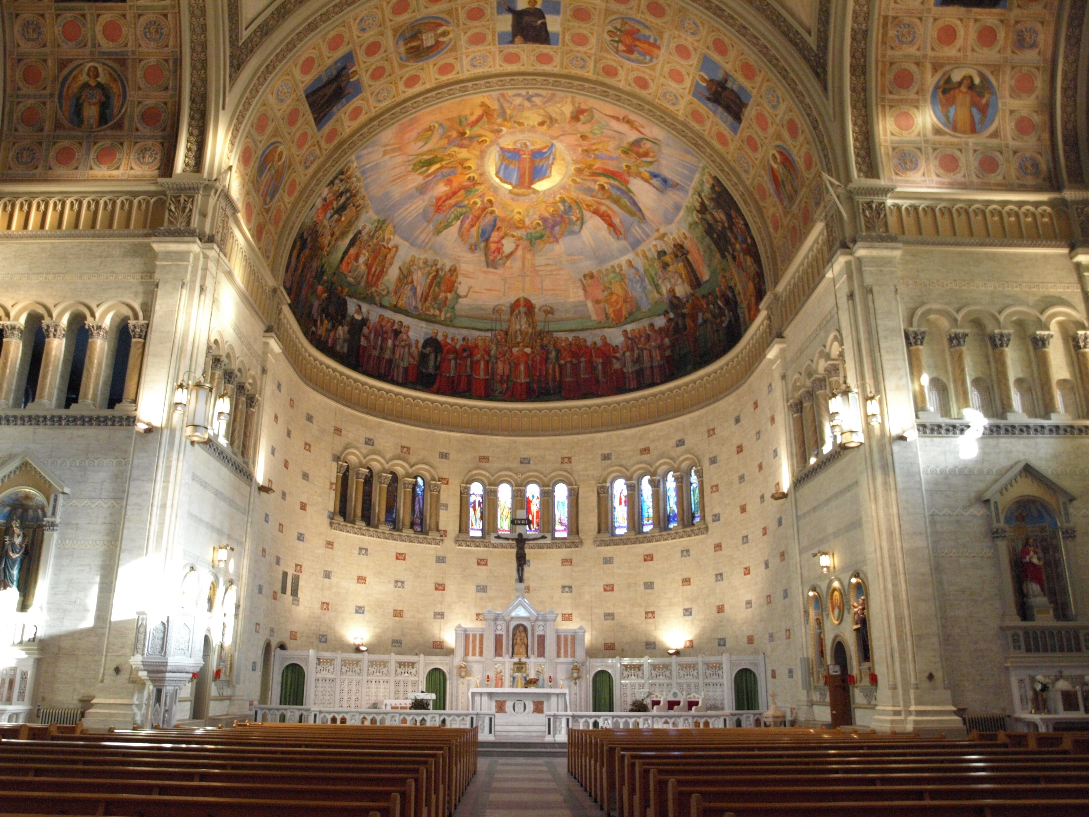 L’affresco, che si trova nell’abside della Chiesa Notre-Dame-de-la-Defense, nella Piccola Italia di Montréal, fu dipinto da Guido Nincheri (Prato, 1885-Providence, Usa, 1973) nel 1931 e raffigura il tema dei “Patti Lateranensi”, gli accordi sottoscritti nel 1929 tra il Regno d’Italia e la Santa Sede che regolano ancor oggi i rapporti fra l’Italia e il Vaticano. Nella parte destra dell’affresco si trovano, appunto, Benito Mussolini, a cavallo, accompagnato da Michele Bianchi, Emilio De Bono, Italo Balbo e Cesare Maria De Vecchi.