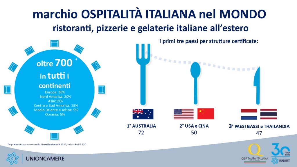 Avviato nel 2010 da Unioncamere con il supporto scientifico di Isnart (Istituto nazionale di ricerche turistiche) per garantire al consumatore standard qualitativi sulle imprese ricettive e ristorative certificate, con l’obiettivo di promuovere e sostenere i prodotti, il servizio e lo stile italiano nel mondo, il marchio identifica e valorizza gli esercizi che fanno della qualità e del Made in Italy gli elementi cardine della propria attività. Secondo gli ultimi dati disponibili i ristoranti e le pizzerie gestite da italiani all’estero sono 72mila con un fatturato di oltre 27 miliardi di euro l’anno.