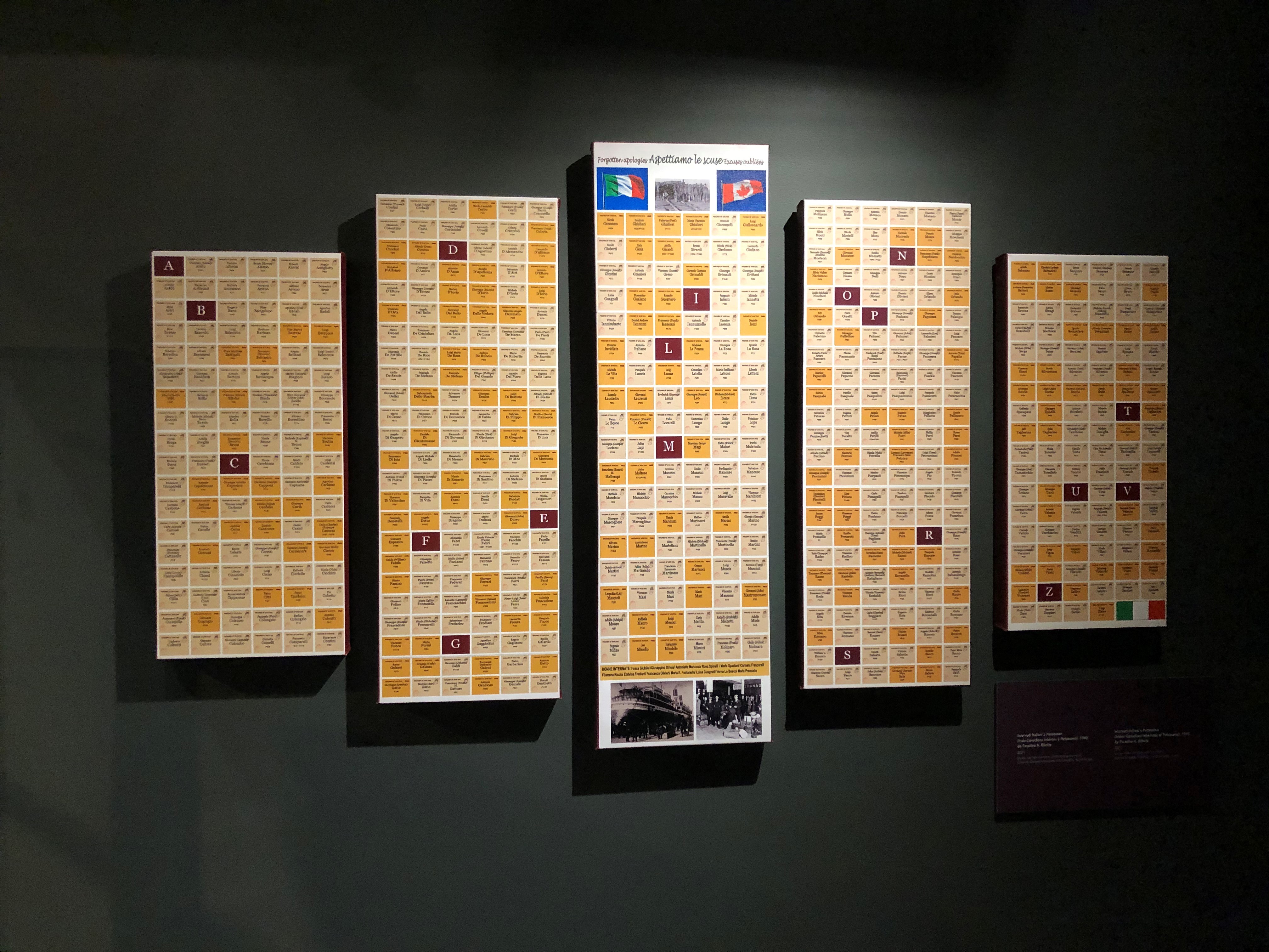 In quelle 600 caselle ci sono 600 storie che io ho letto, storie raccontate grazie al progetto “Gli italocanadesi come stranieri nemici: ricordi della seconda guerra mondiale”. (http://www.italiancanadianww2.ca/it/villa/home) del Columbus Centre e Villa Charities di Toronto che ha raccolto i ricordi personali di internati, stranieri nemici e loro familiari grazie al lavoro di tante persone tra cui, in particolare, il direttore esecutivo Giulio Recchioni, la direttrice del progetto Lucy Di Pietro e il ricercatore Travis Tomchuk. Dunque, ho voluto rendere un omaggio a queste persone e rendere pubblici tutti quei nomi.