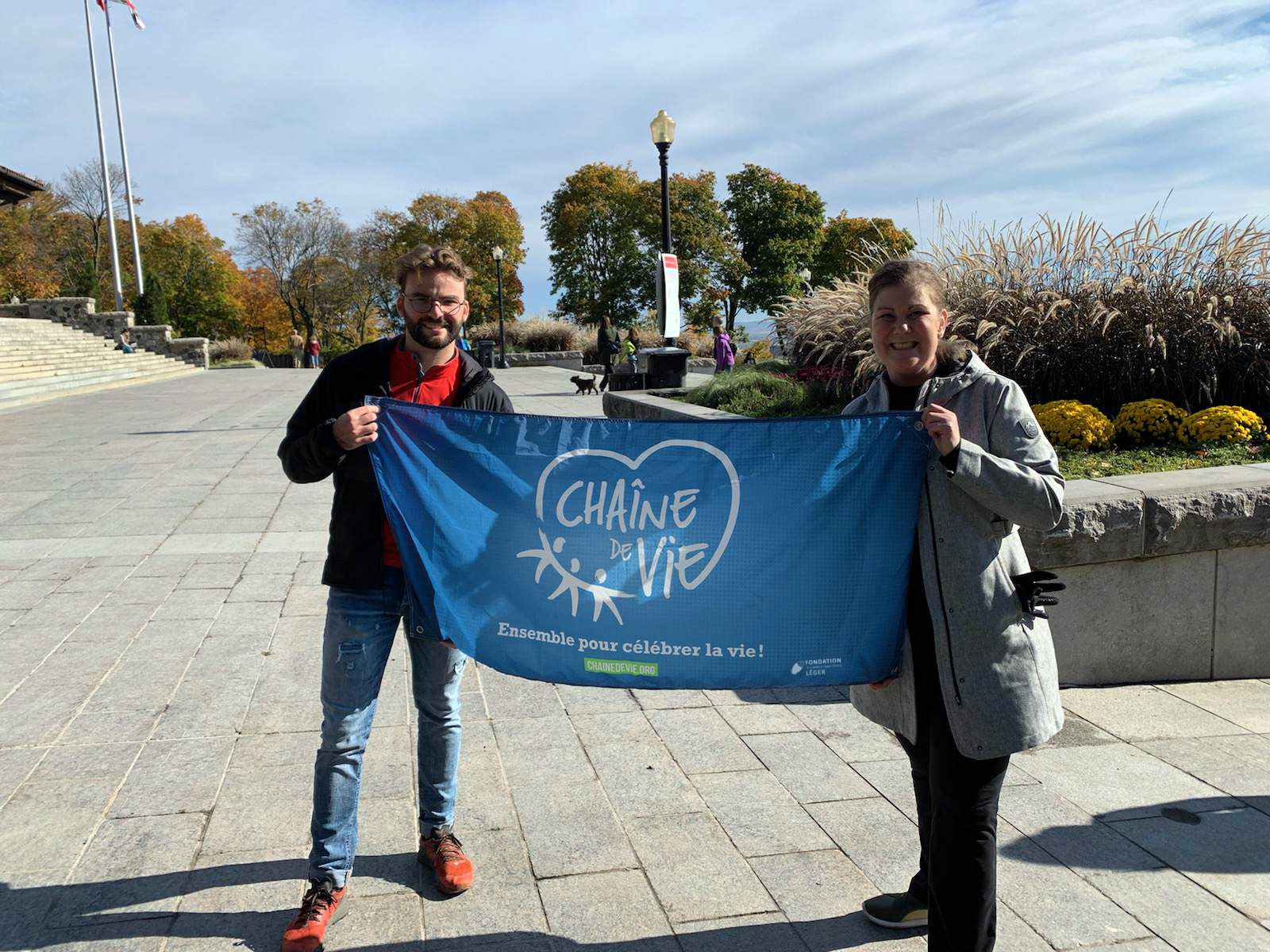 16 portabandiera di 16 regioni del Québec hanno scalato una montagna della loro regione per portare la bandiera “Chaîne de vie” in cima, a simboleggiare la “catena” della vita, ovvero di tutti coloro che tra insegnanti, studenti, cittadini, infermieri, medici, pazienti, famiglie di donatori, poliziotti trasportatori di organi, trapiantati, ecc., sono implicati nel lungo processo relativo al trapianto di un organo.