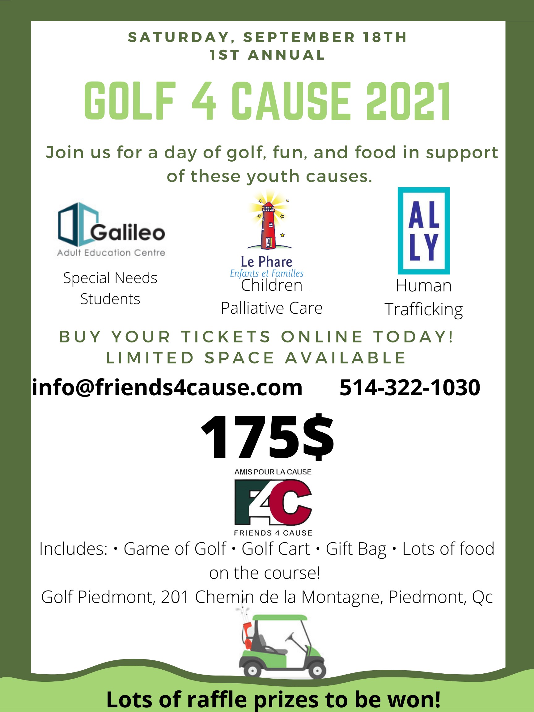 L’associazione “Friends 4 Cause” vi invita a partecipare al loro primo torneo di golf annuale “Golf 4 Cause” che si terrà sabato 18 settembre, presso Golf Piedmont, 201 Chemin de la Montagne, Piemonte, QC.