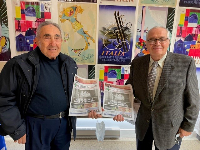Pasquale, 82 anni, di Casacalenda (Campobasso) e Leopoldo, 72 anni, originario di Galluccio (Caserta), tengono nella loro mano una copia del Corriere Italiano del 21 ottobre che presenta in prima pagina proprio una delle foto scattate da Paolella (nel 2018) che li ritrae davanti all’ingresso della Madonna della Difesa con in mano la statua della Vergine Maria, in occasione della tradizionale processione del 15 agosto.