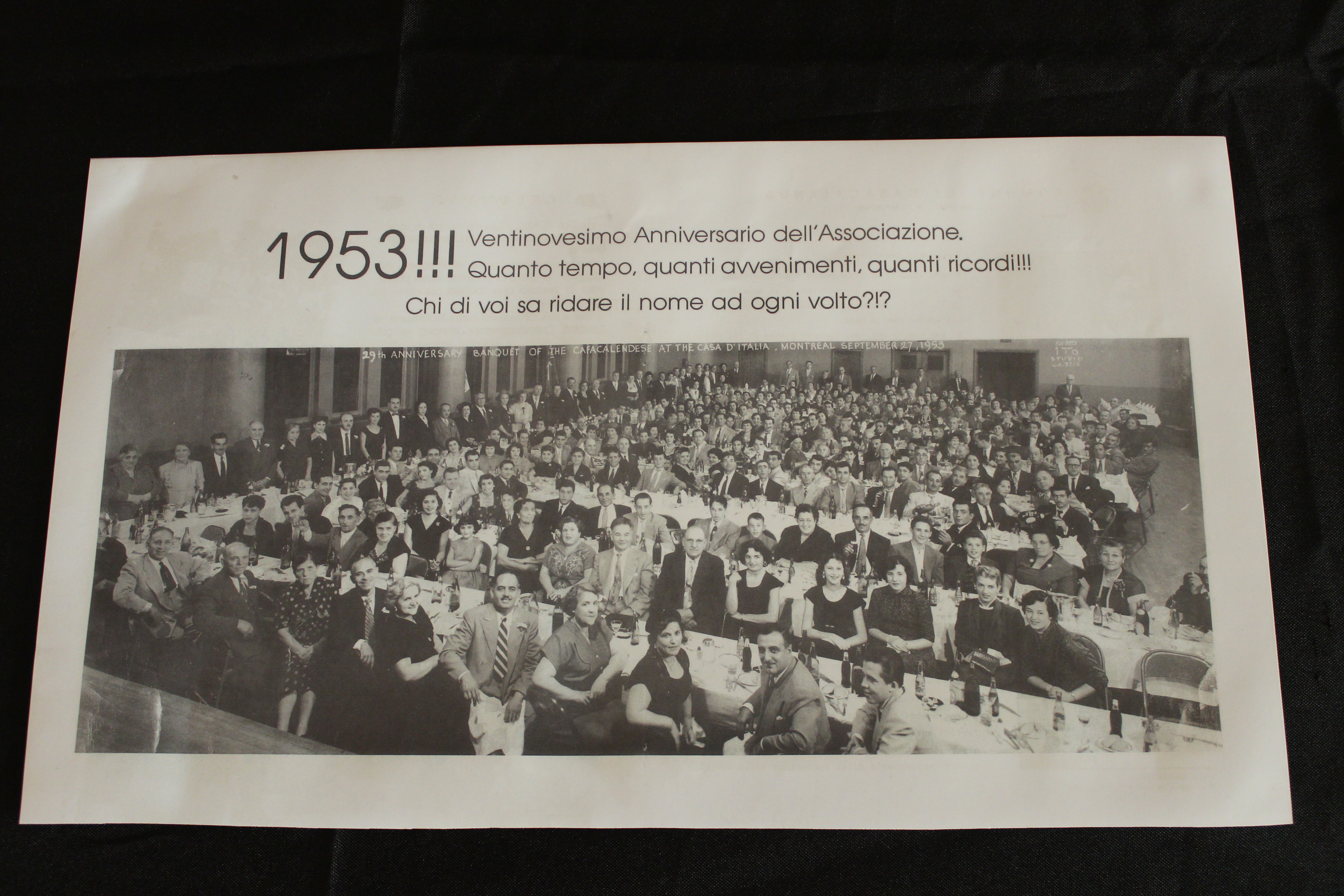 Ecco una foto a dir poco “storica”! Si tratta del banchetto per il 29mo anniversario dell’Associazione Casacalendese, svoltosi il 27 settembre del 1953 alla Casa d’Italia. C’è per caso qualcuno che è in grado di riconoscere le persone che sono nella foto o, perché no, di riconoscersi? Fatacelo sapere!