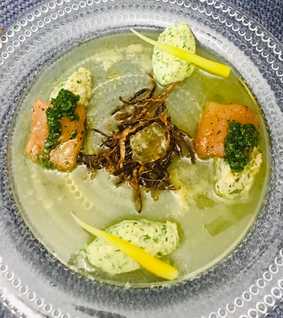 Prima di tutto sfilettate le trote ottenendo dei quadratini porzionati. Con le lische e le teste, prendete un casseruola, mettete 1 litro e mezzo d’acqua fredda, 2 gr. di sale, e 2 di zucchero, poi aggiungete un gambo di sedano, 1 cipolla bianca sbucciata e divisa a metà, lo zenzero sbucciato, e in gambi (mi raccomando non le foglie) di coriandolo. Portate tutto ad ebollizione, filtrate il fumé/ brodo ottenuto, e solo a questo punto, metteteci lo zafferano, e lasciate che prenda colore; infine, una parte mettetela in congelatore per circa un’ora.