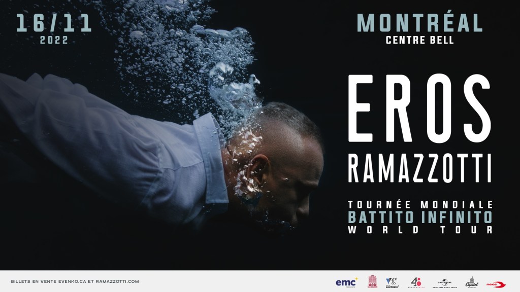 Il 30 ottobre partirà poi il “Battito Infinito World Tour”, un’immensa avventura live fatta di 60 concerti nelle più importanti città del mondo tra cui, Montréal, il 16 novembre 2022 (Centro Bell; biglietti in vendita dal 23 giugno alle ore 10:00 su: www.evenko.ca o www.ramazzotti.com ) e Toronto, il 18 novembre (Scotiabank Arena).