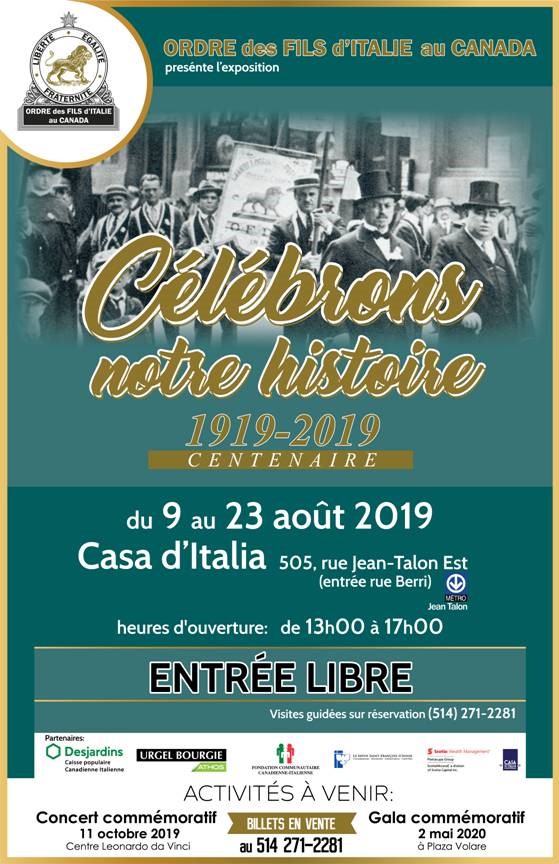 La storia di O.F.I. simboleggia la storia degli italo-canadesi nel loro nuovo paese ospitante. La mostra “Cent’ anni ― Ordine Figli d’Italia 1919-2019” è stata creata con l’obiettivo di documentare gli innumerevoli eventi culturali, sportivi e sociali dell’O.F.I. e onorare lo spirito dei suoi fondatori e membri.