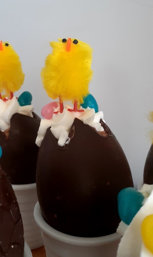 Decorare a piacere (pulcini, piccole uova di cioccolato, caramelle o altro) e … buona Pasqua!