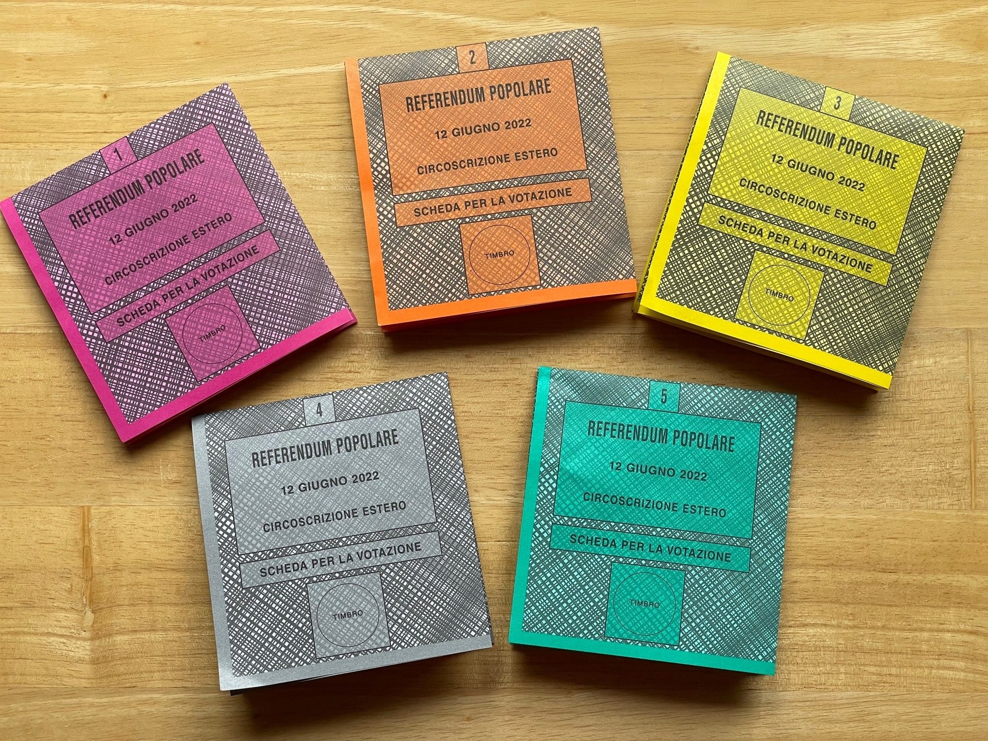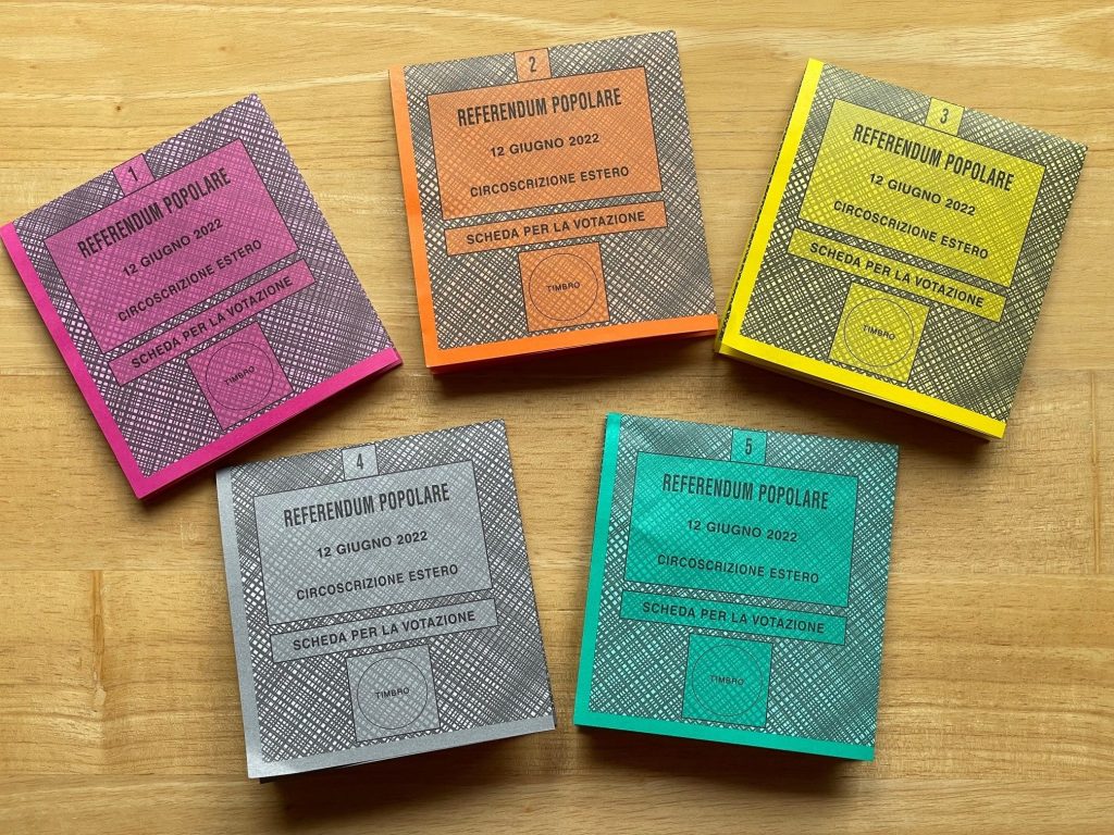 le schede dei cinque referendum e la relativa busta piccola, nonché una busta grande preaffrancata recante l’indirizzo dell’Ufficio consolare competente; un foglio esplicativo delle modalità di voto.