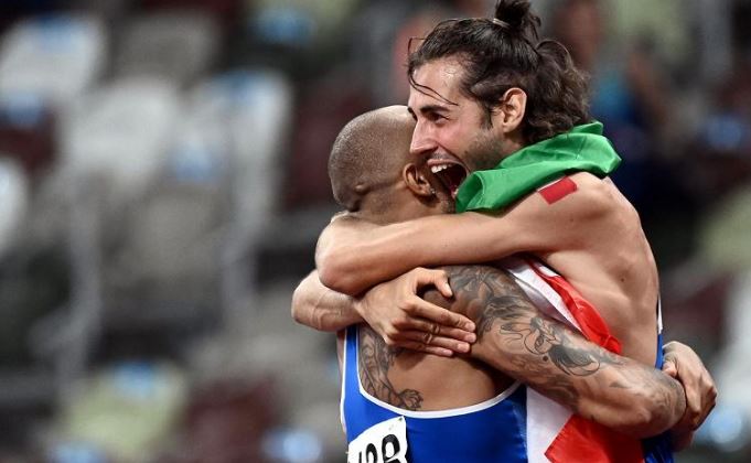 E nella storia ci resterà anche l’abbraccio con Gimbo Tamberi, che 5 anni fa a Rio aveva dovuto rinunciare, nonostante fosse uno dei favoriti per la vittoria, a causa di un grave infortunio che lo ha costretto al gesso nel piede destro. Un gesso che si è portato ieri in pedana, combattendo con il suo amico e avversario qatariota Barshim, con il quale alla fine ha deciso di condividere (per una perfetta parità) la medaglia più prestigiosa. E la loro esultanza quasi simultanea, resterà nella memoria collettiva dell’Italia.